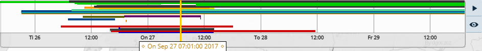 Ønsket tidspunkt for visning kan velges enten ved å trekke markøren på tidslinja eller velge et tidspunkt i dato/tid-verktøyet. Objektene som vises i kartet vil gjenspeile situasjonen under hendelsen på det gitte tidspunktet.