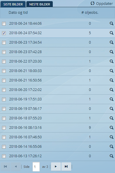 Ved oppstart er fanen Siste bilder aktiv og de 15 nyeste tilgjengelige bildene vises i lista. Fanen Neste bilder viser de 15 neste planlagte bildene.